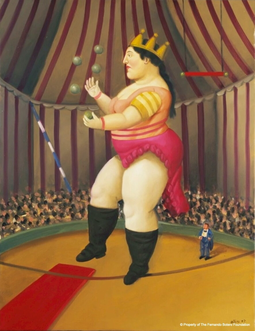 波特羅的「圓滾滾」主義貫穿他所有創作,從動物、靜物、人物肖像到宗教題材,展現獨樹一格的幽默感,讓觀眾一眼難忘之餘,更容易走進他的藝術世界。馬戲團系列作品中,熱鬧氛圍常夾雜小人物的憂鬱情感;宗教主題中的修女與神父,既非嚴肅批判,也非虔誠頌揚,而是透過誇張造型和幽默筆觸,把對神職人員的諷刺藏在圓潤龐大的身軀裡;向藝術大師致敬的系列作品,更將他特有的風格發揮得淋漓盡致,把西洋經典畫作變成全新視覺驚喜。