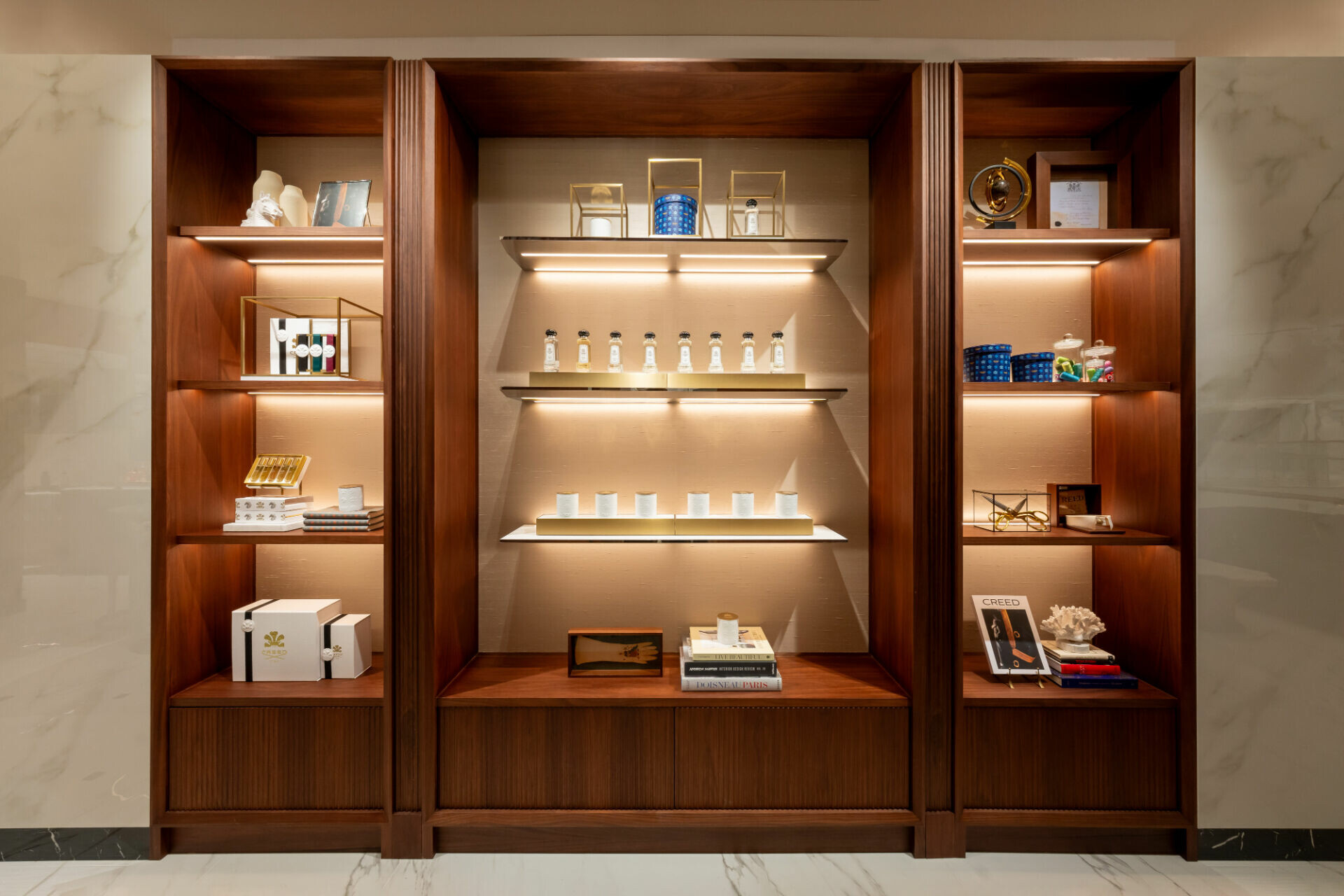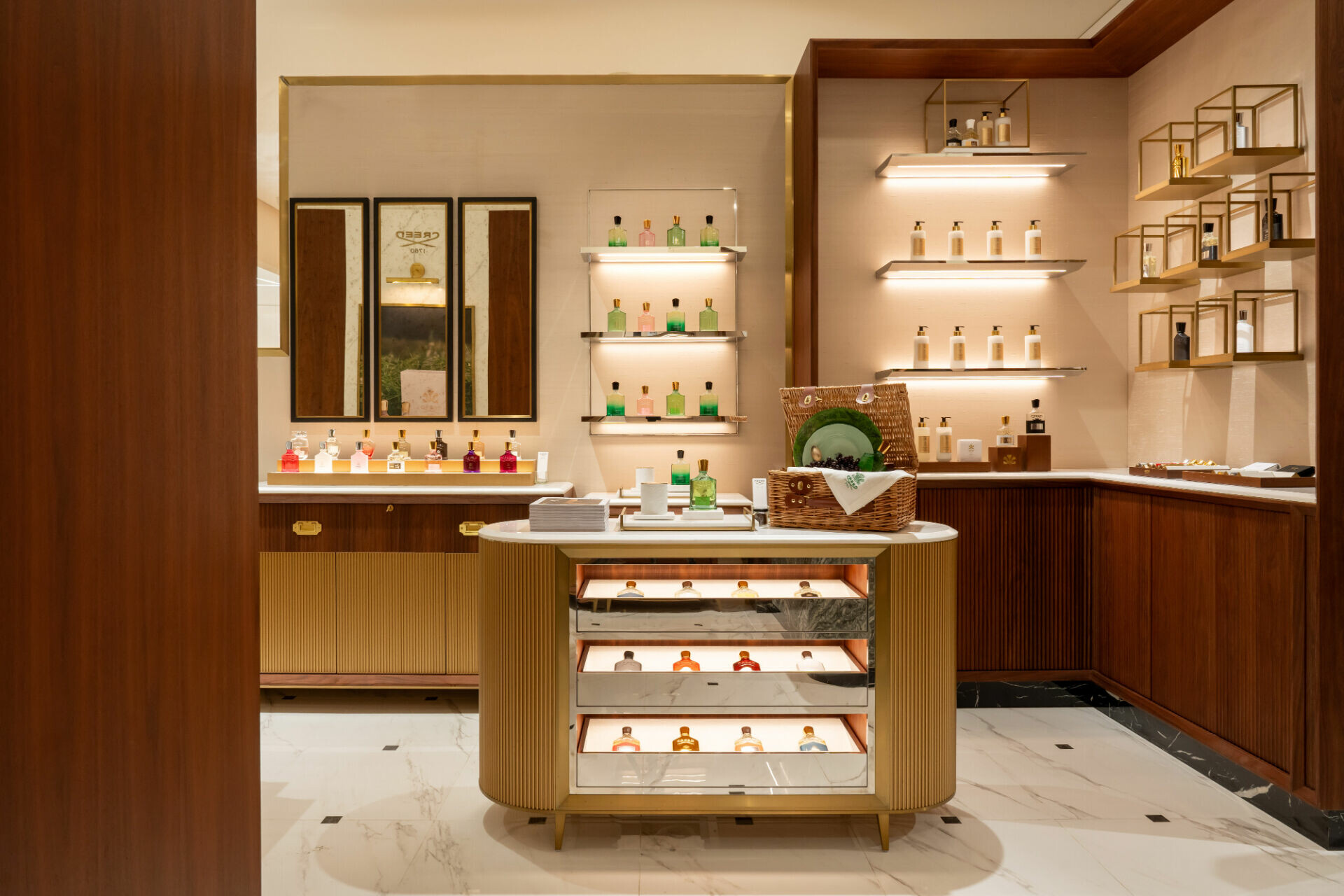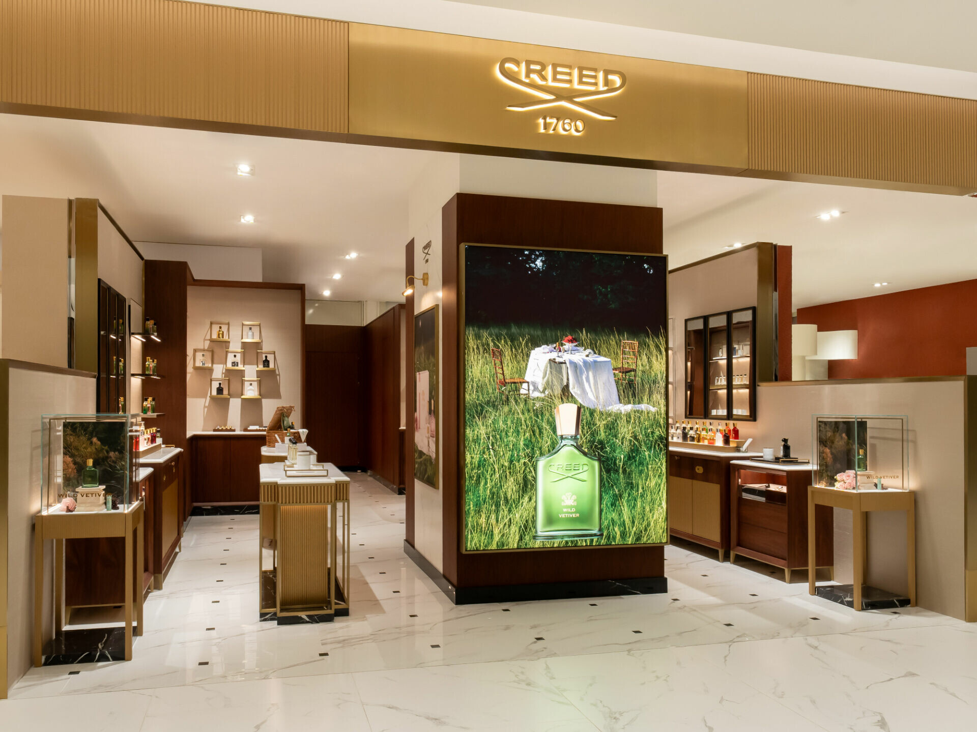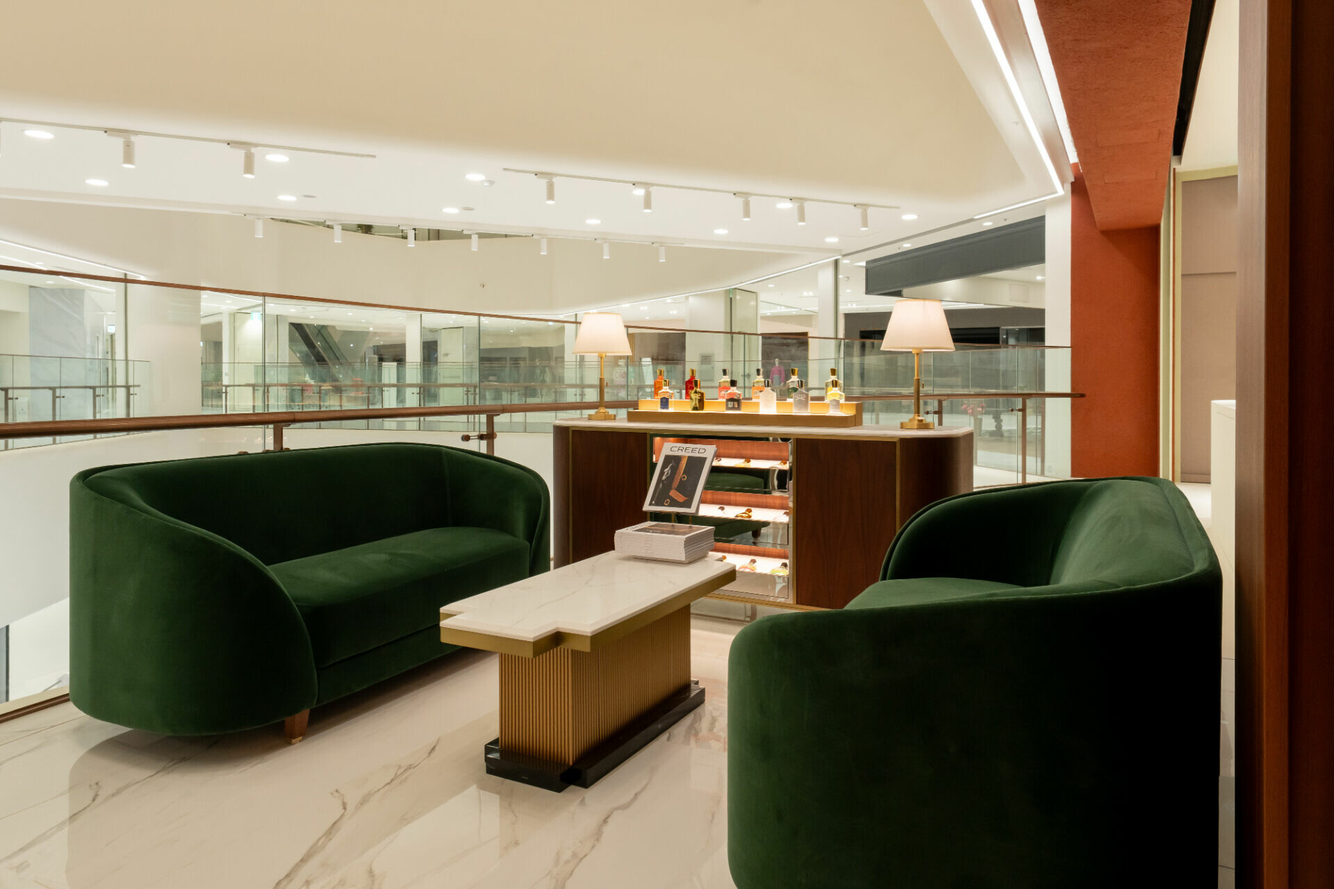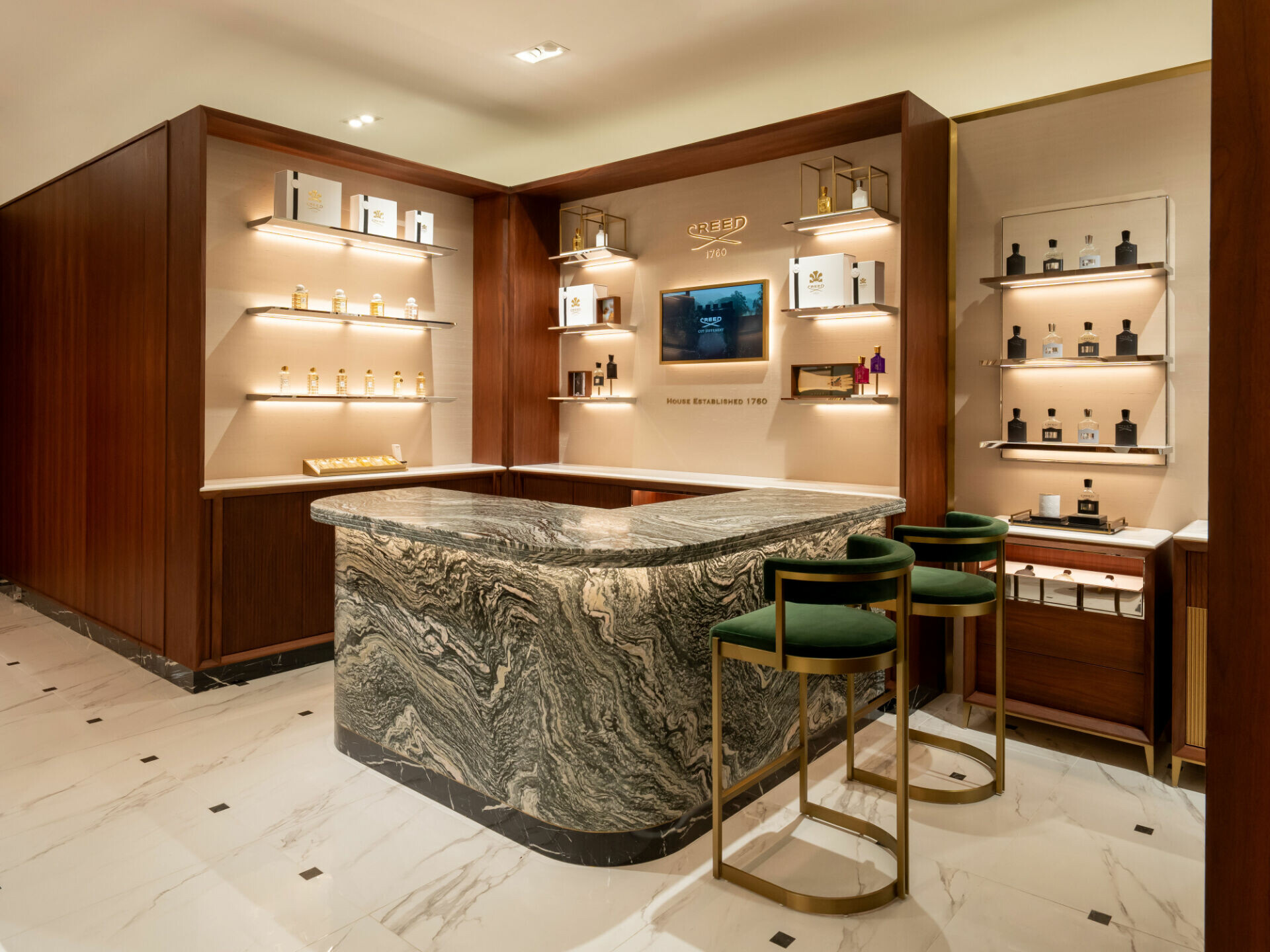 CREED全新品牌獨立專門店由開放式展示過度至相對沉靜的內部座席區,形成由外而內的感官轉換,營造相對私密且更為從容的試香氛圍。顧客可於此放慢步調,從瀏覽、試香到停留,逐步感受香氣變化,