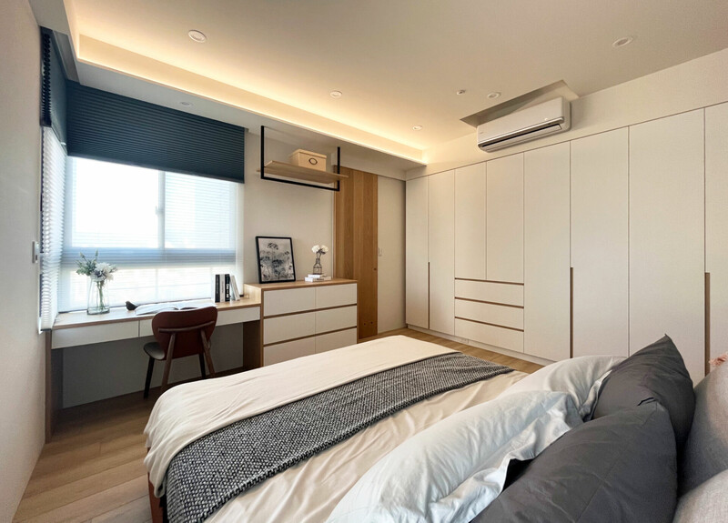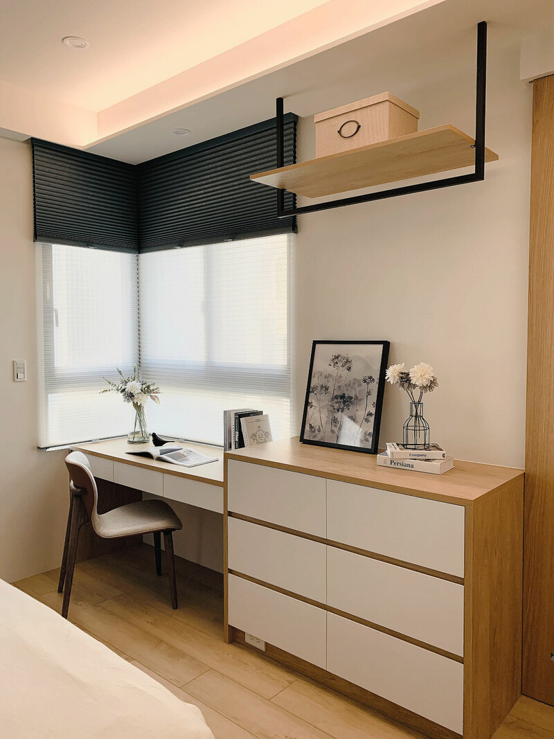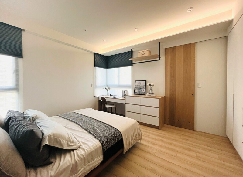 主要材質:EGGER、樂邁石塑地板、得利特殊色、風琴簾、長虹玻璃、鐵件、崁入式燈條