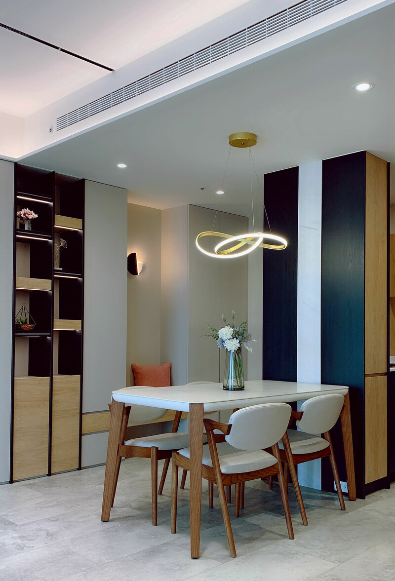 全室以屋主夫妻喜歡的簡約色調做為主韻,公領域採用簡歛的黑白美學搭配木紋貫穿全場,並善用高櫃體設計擴充收納空間、於連續面的櫃體交錯與格局的開放安排,引導動線暨輔助明確機能分區結合玄關、餐廳、廚房、客廳區。