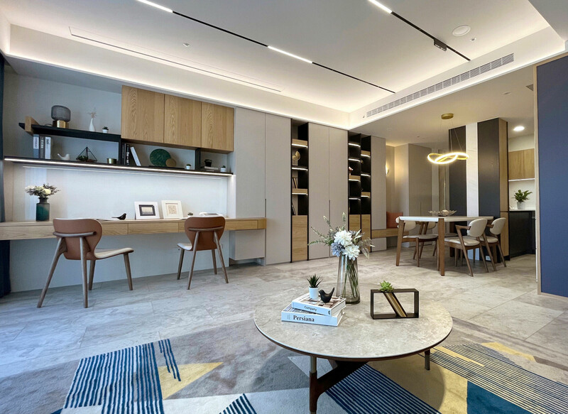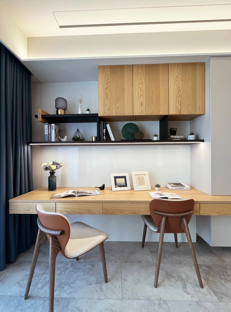 在有限的空間內客廳區去除了電視牆改用升降天花投影布幕,因此多了一個閱讀空間,使公領域更加寬敞舒適帶來更多的空間效益,讓家人間的互動更為頻繁且蘊涵溫度,窗外自然光線灑落室內,營造出悠閒舒適愉悅的自然氛圍。