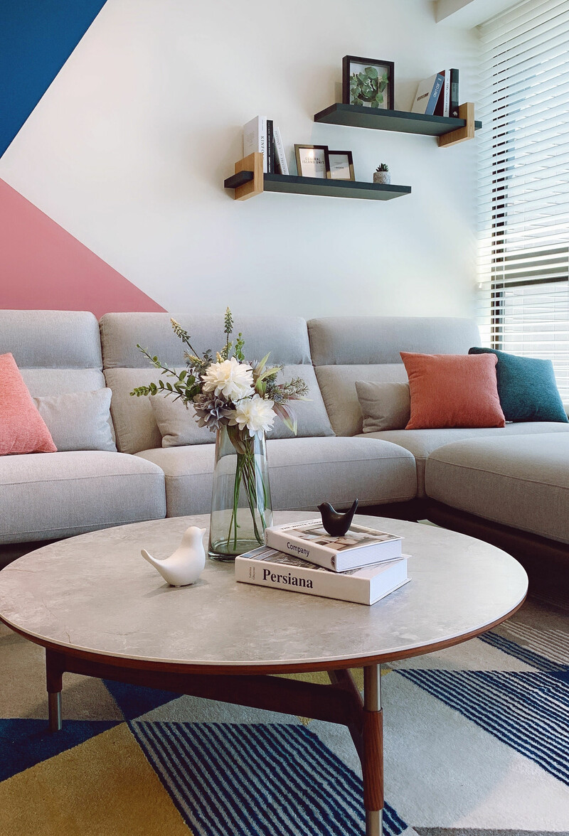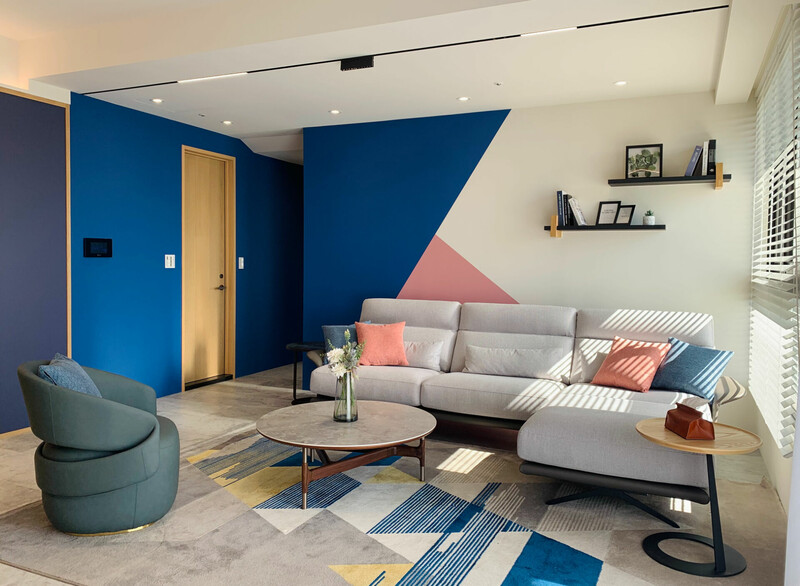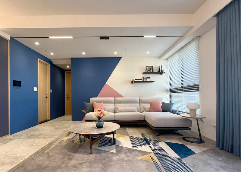 沙發背牆運用活潑的跳色點綴空間,以飽和度高的藍色和淡雅的粉色對比搭配並運用家具軟裝來營造更活潑的空間氛圍,精彩闡述現代幾何與原始色調的豐富變化。