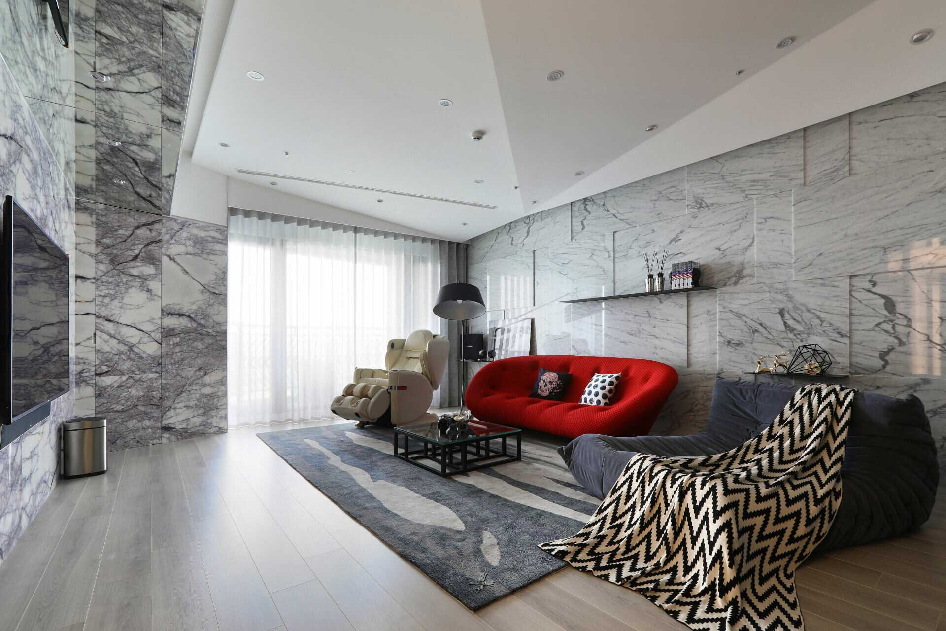 主要建材:木皮材、美耐板、木地板、玻璃、鐵件、系統櫃、大理石
