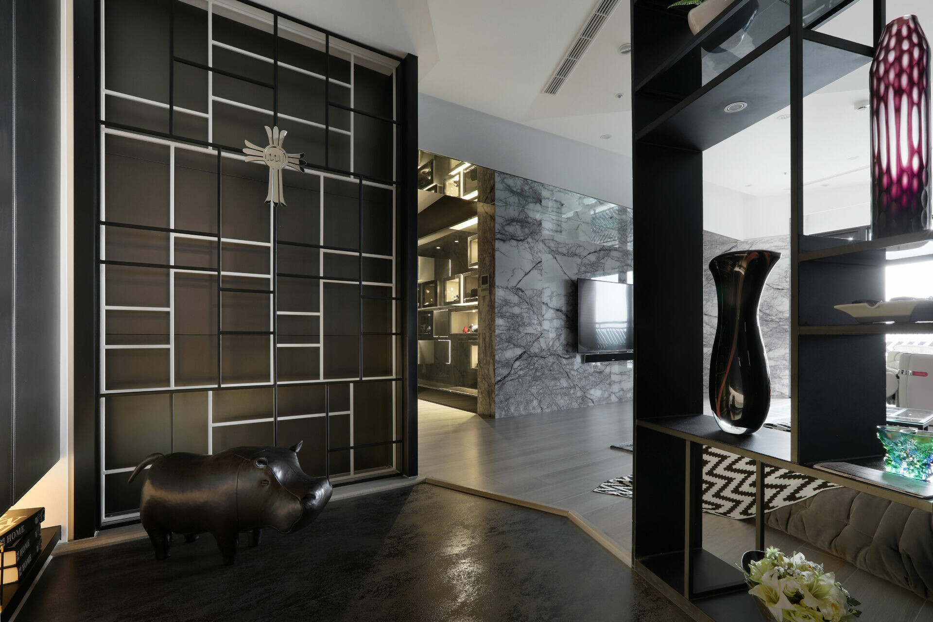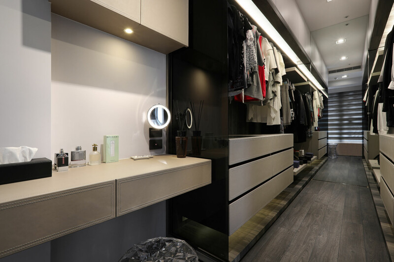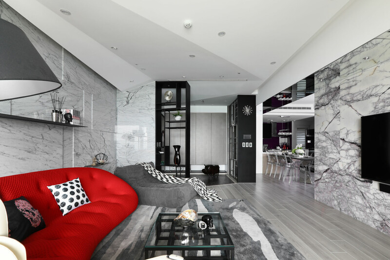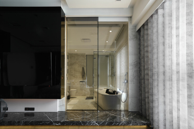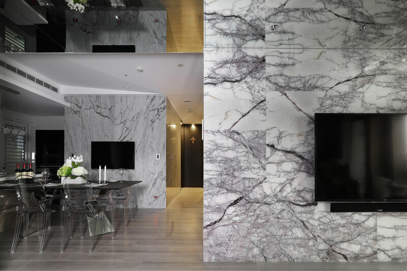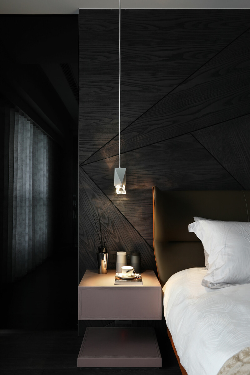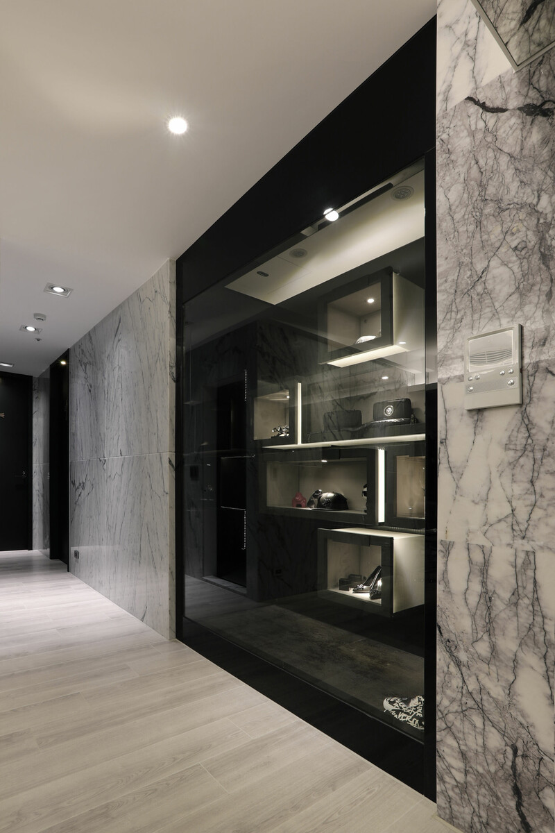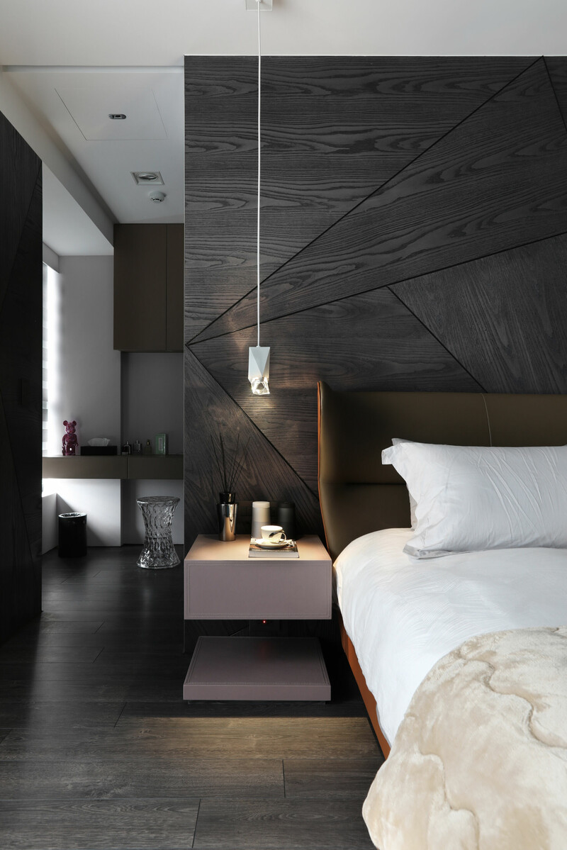 入玄關便可感受簡潔俐落感受,採皮革佐以黑白鐵件圍塑端景牆,並將哥德式家徽嵌入,讓屋主對家庭與妻子的重視,無遺地表露於空間細節中。天花的幾何造型就如同鑽石切面一般耀眼,巧妙運用大理石材的大器視感,搭配石材紋理、拼貼手法打造視覺層次。此外,幾何線條亦延續至臥眠空間,有別於公領域的明亮氛圍,主臥採沉穩內斂的黑白灰色鋪陳,搭以木質語彙賦予場域溫潤感受,完美營造舒心自在氛圍。