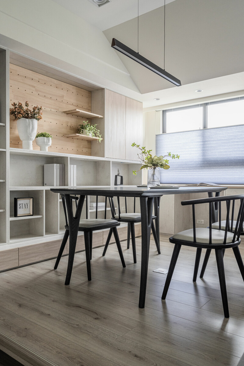 在空間分割上將書房做成開放式,除卻工作後的放鬆,假日時亦可組裝男主人喜歡的模型,也一併留置了朋友來時可當餐桌的功能。後方的展示架及走道的展示空間也未男主人預留了,球賽季開打後為支持隊伍的加油吶喊。
